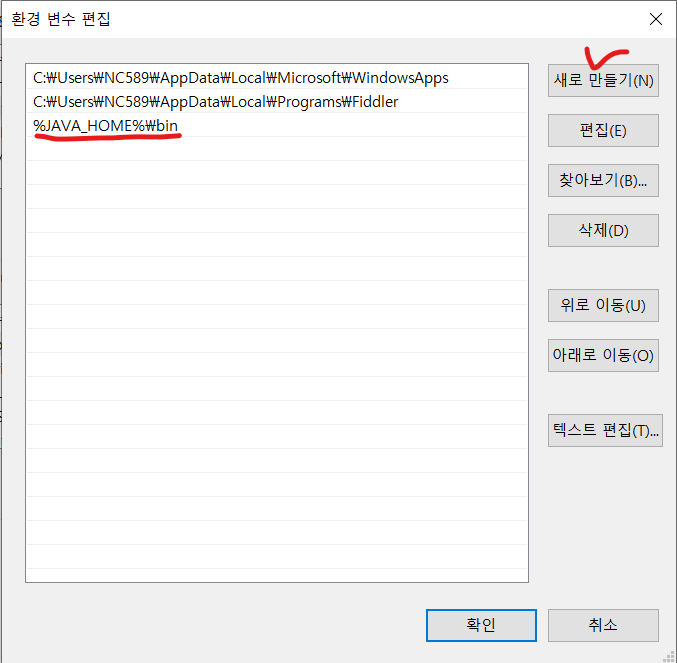 7. 새로 만들기 클릭 후 밑줄쳐진 경로를 입력 후 확인을 클릭한다.