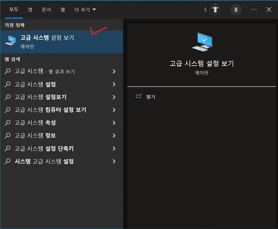 1. window 검색창에서 고급 시스템 설정 보기 검색 후 클릭