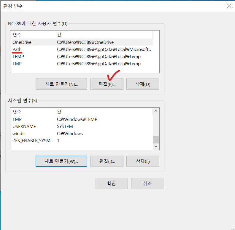 6. 사용자 변수의 Path 클릭 후 편집을 클릭한다.