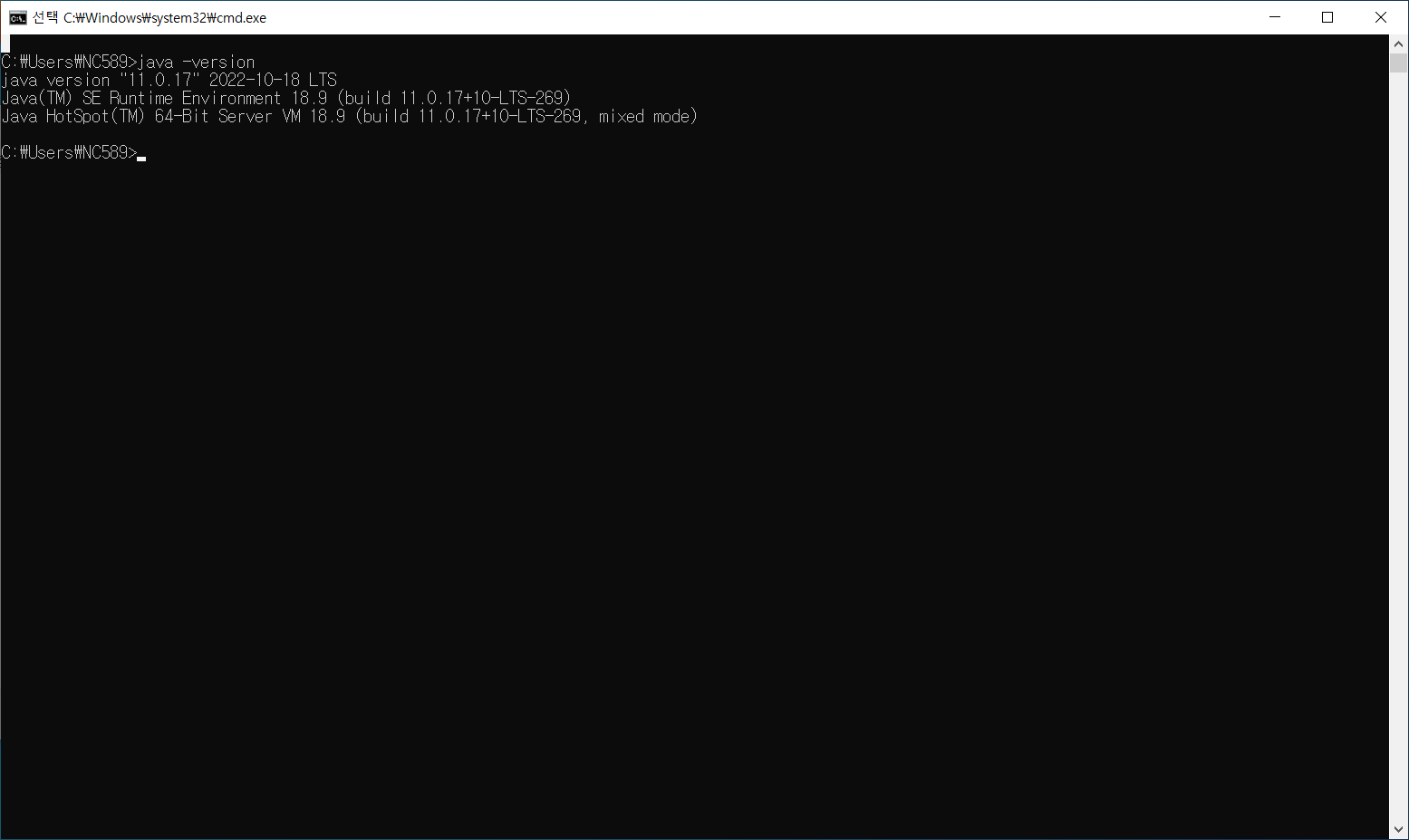* 환경변수 설정이 끝났다. cmd창에서 java -version을 통해 설치된 버전을 확인 가능하며, 하단 2번째 사진의 명령어 입력 시 결과물이 동일하게 출력된다면 정상 설정 된 것이다.