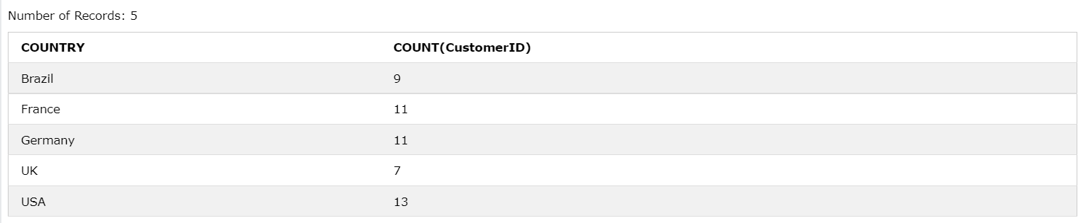 -> HAVING절 뒤에 COUNT(CustomerID) > 5 조건을 명시함으로서 5이하의 데이터는 레코드에 포함되지 않게끔 할 수 있다.