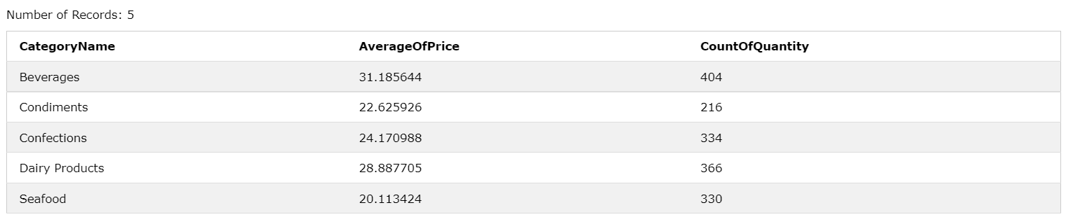 위 레코드를 CategoryName으로 GROUP지정 후 HAVING절에 판매수량(Quantity)이 200개 이상의 조건을 명시함으로서 위 사진과 같은 레코드를 반환받고 있다.