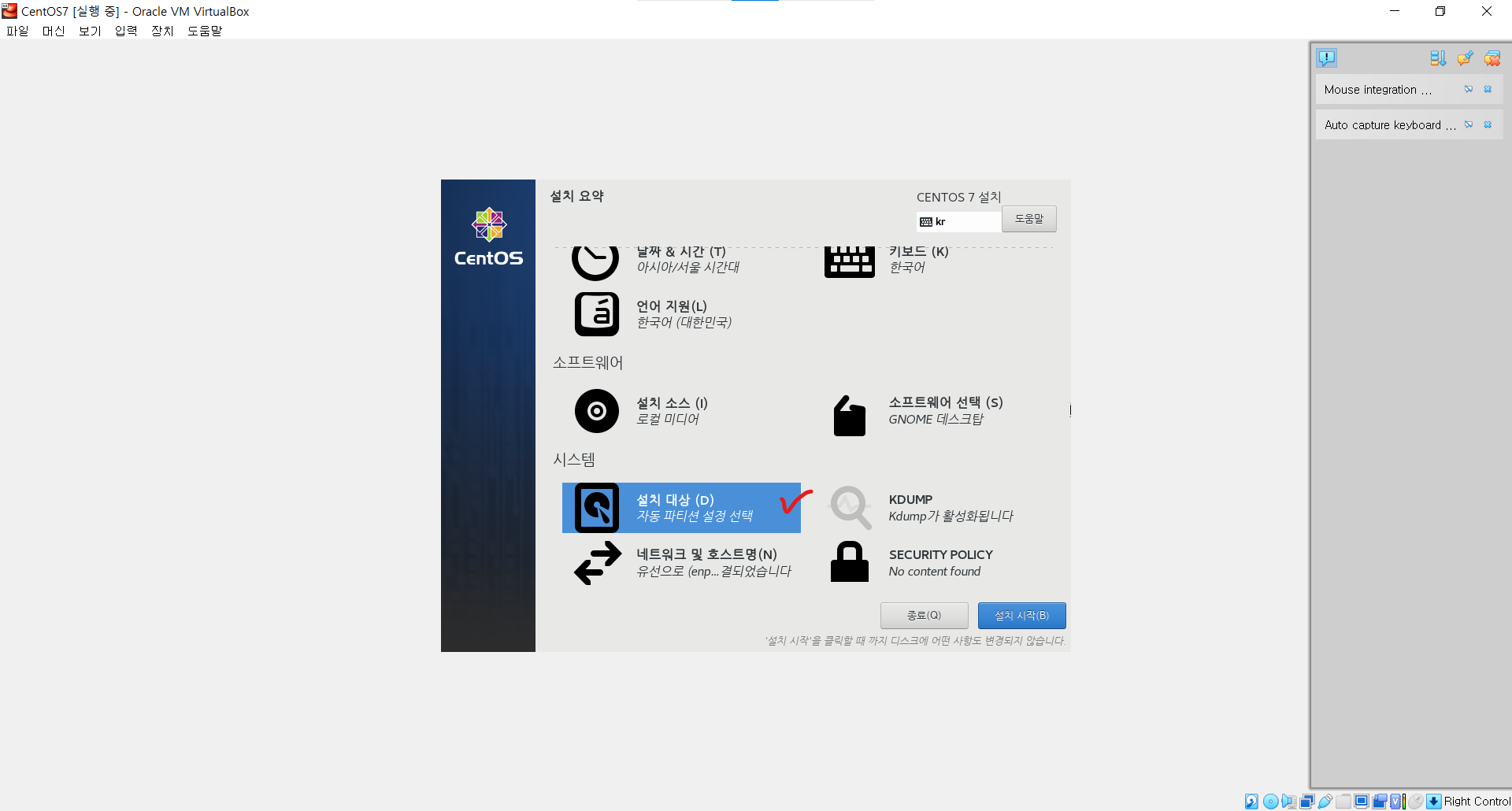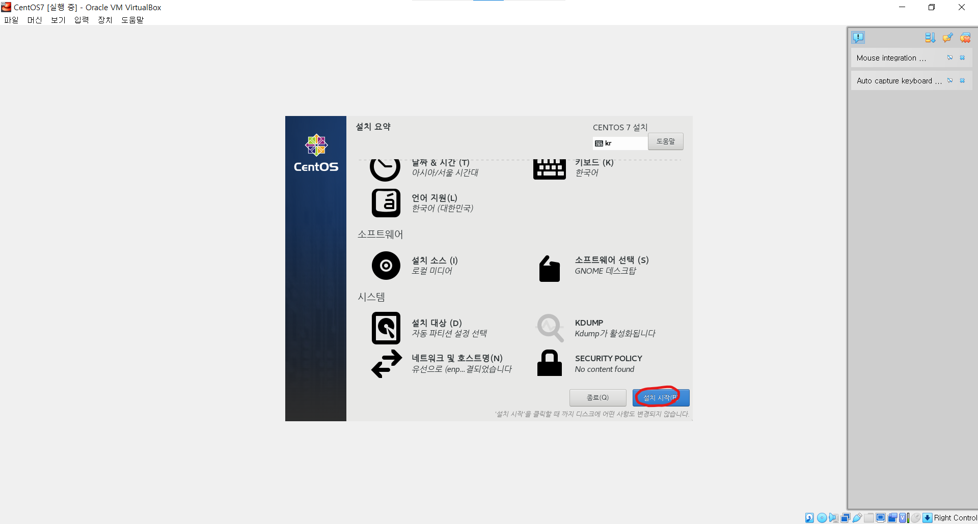 ㆍ 설정이 끝났으며 아래의 설치시작 버튼이 활성화 되었다. 설치를 시작한다.