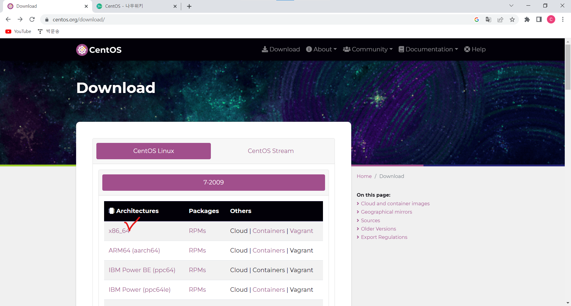 ㆍ 이동하면 아래와 같은 사이트에 접속하게 된다. x86_64를 클릭한다.