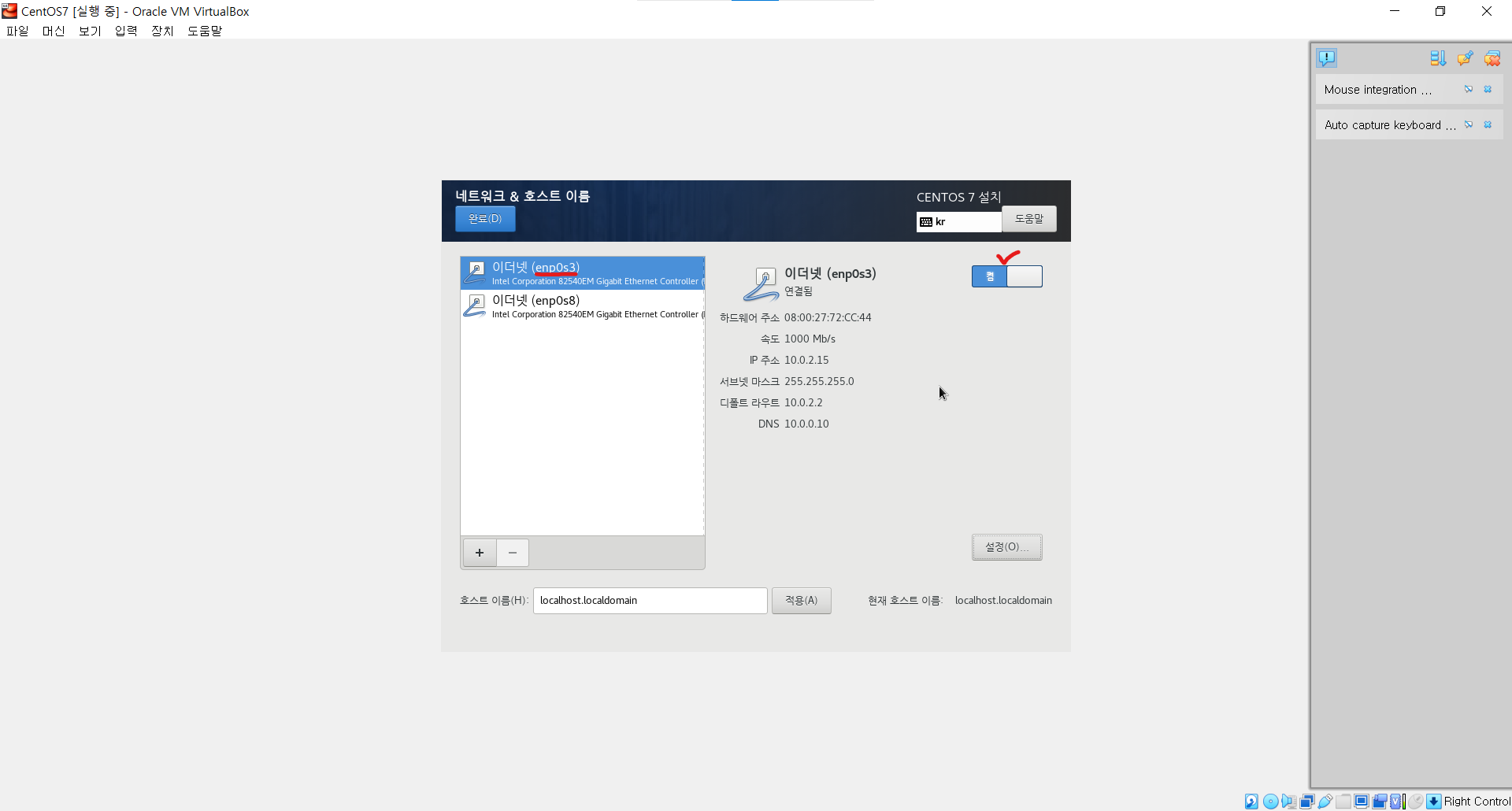 ㆍ 이더넷(enp0s3)을 클릭 후 네트워크를 켬으로 변경한 후 완료한다.