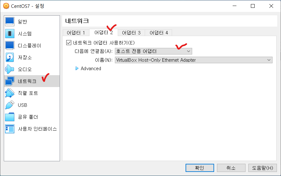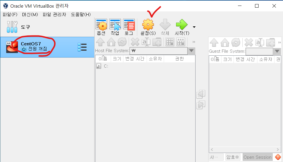 ㆍ 생성 후 아래와 같은 화면이 나온다. 방금 생성한 CentOS7클릭 후 설정으로 들어간다.