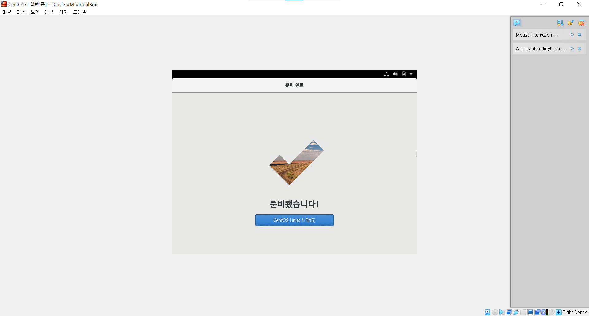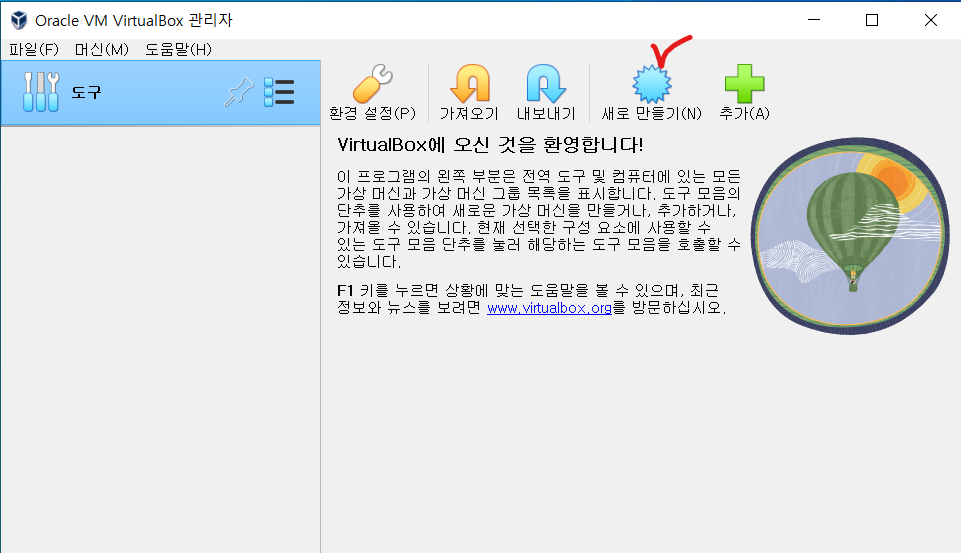 ㆍ 설치 완료 후 실행하면 아래와 같은 화면을 만나게 된다. 가상머신을 사용할 준비가 완료되었으며 이전에 다운로드 받은 ISO파일을 이용해 CentOS7을 설치해보자.