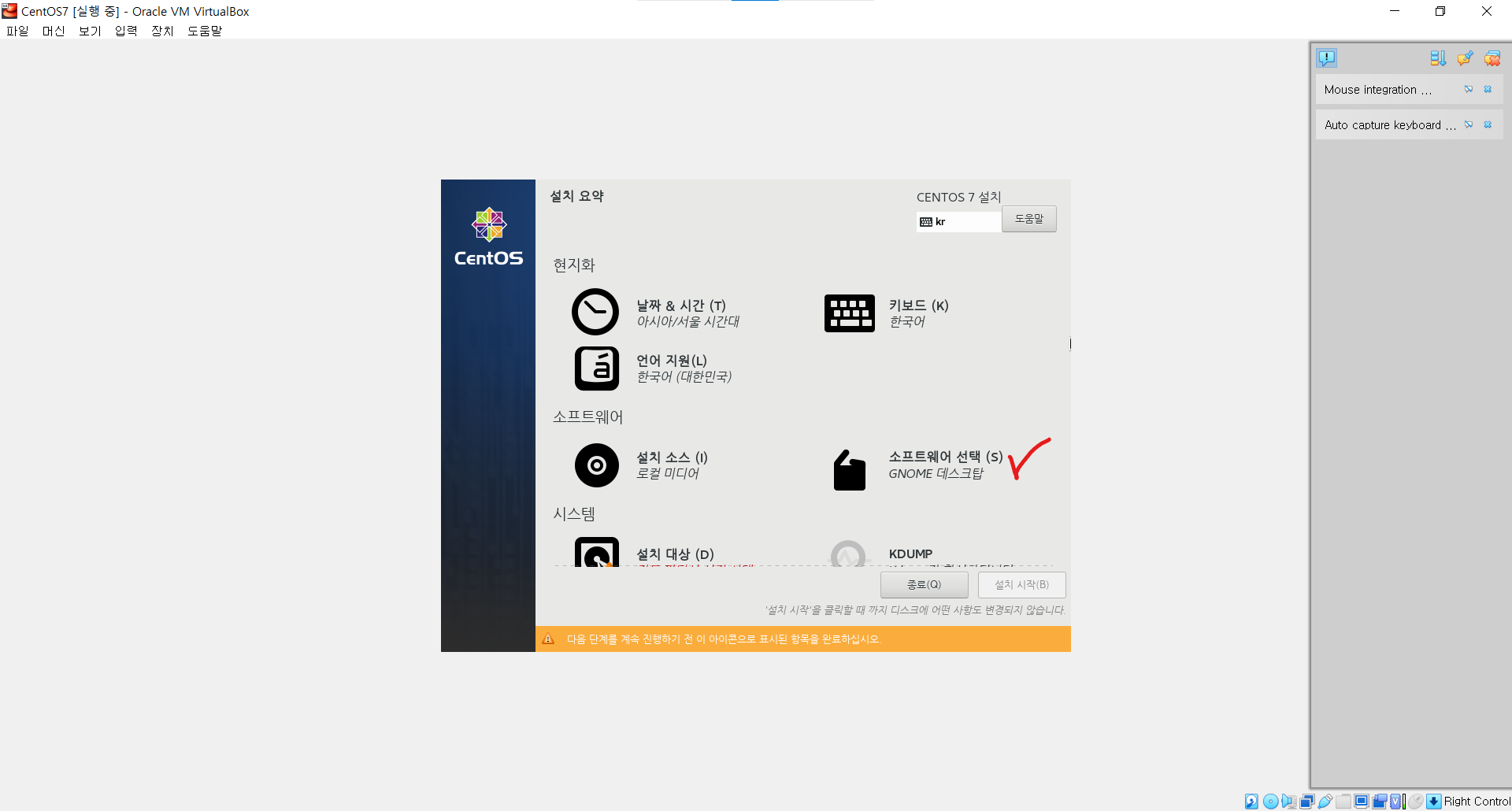 ㆍ 아래 사진과 동일하게 GNOME 데스크탑과 개발용 툴을 선택 후 완료한다.