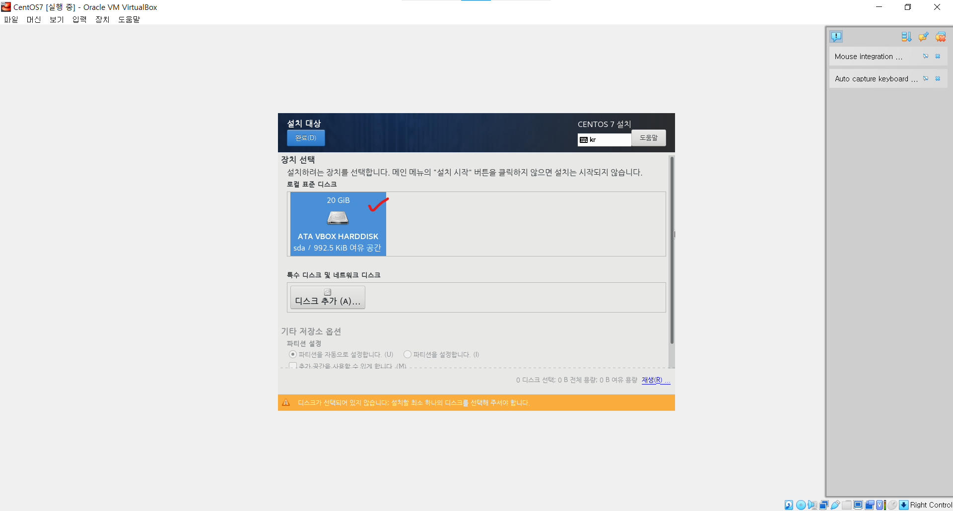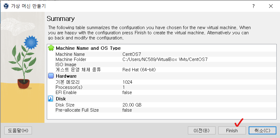 ㆍ 이전 설정시에 할당해둔 20GB짜리 하드디스크를 선택 후 완료한다.