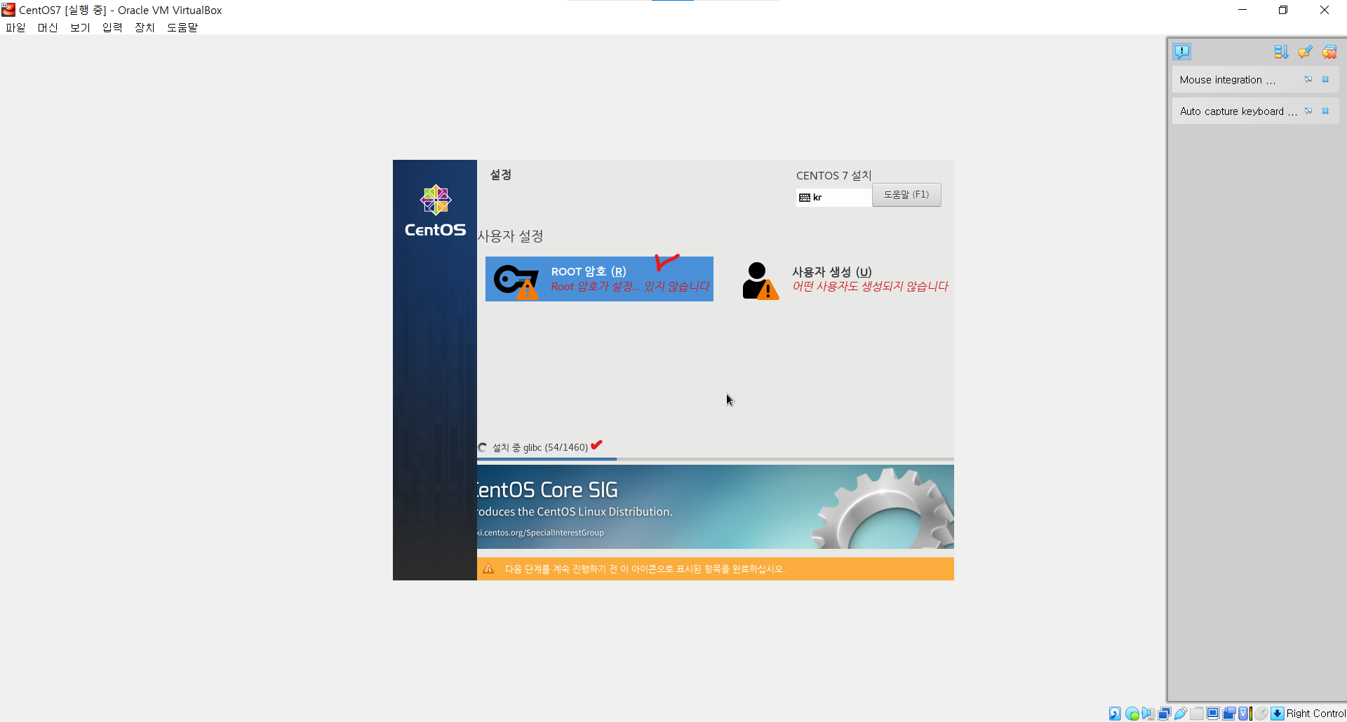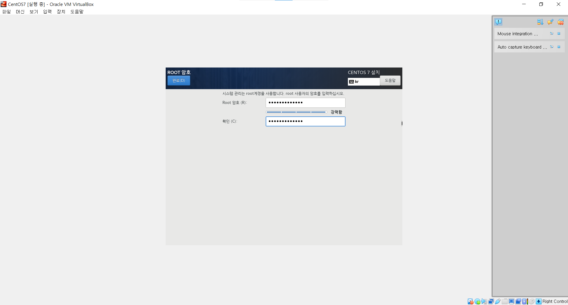 ㆍ 하단에 뭔가 설치를 하고있는 모습이 보인다. OS를 사용할 계정의 비밀번호를 설정해야 한다. ROOT 암호를 선택한다.
