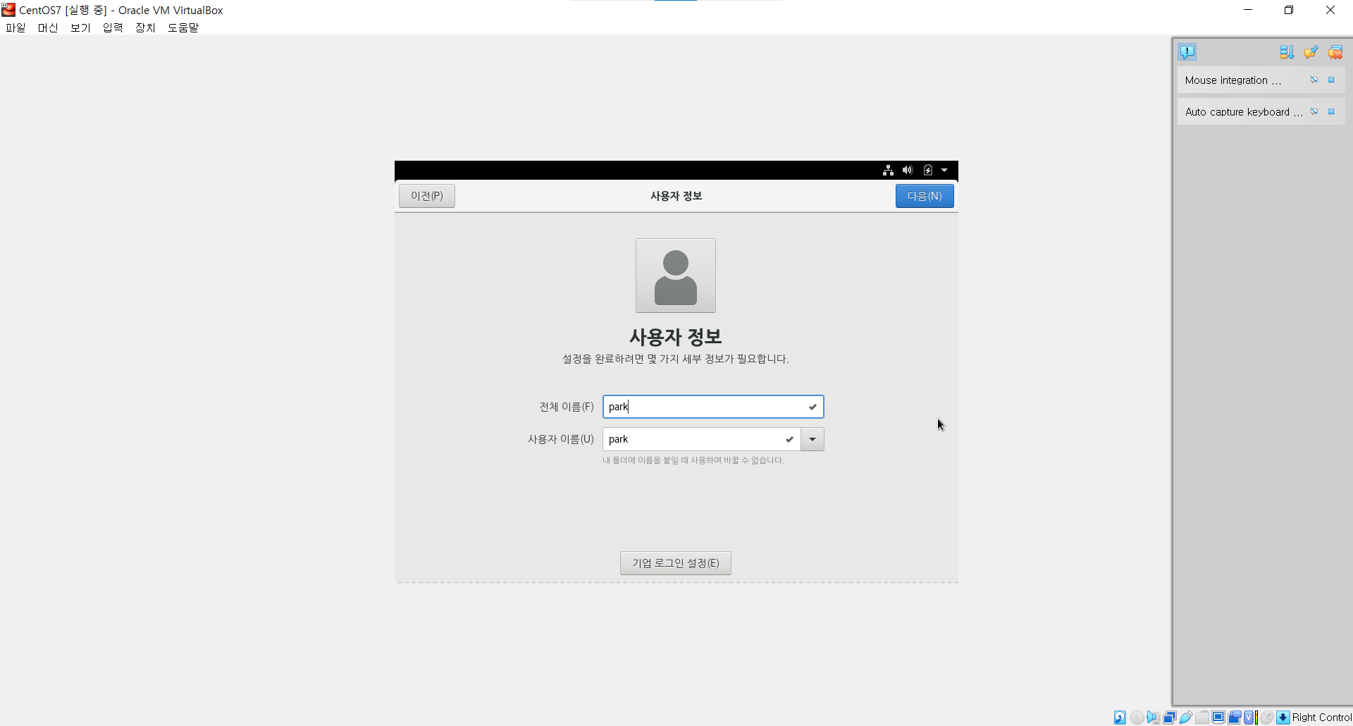 ㆍ 사용자 정보를 입력해야 한다. 편한데로 입력 후 다음으로 넘어간다.