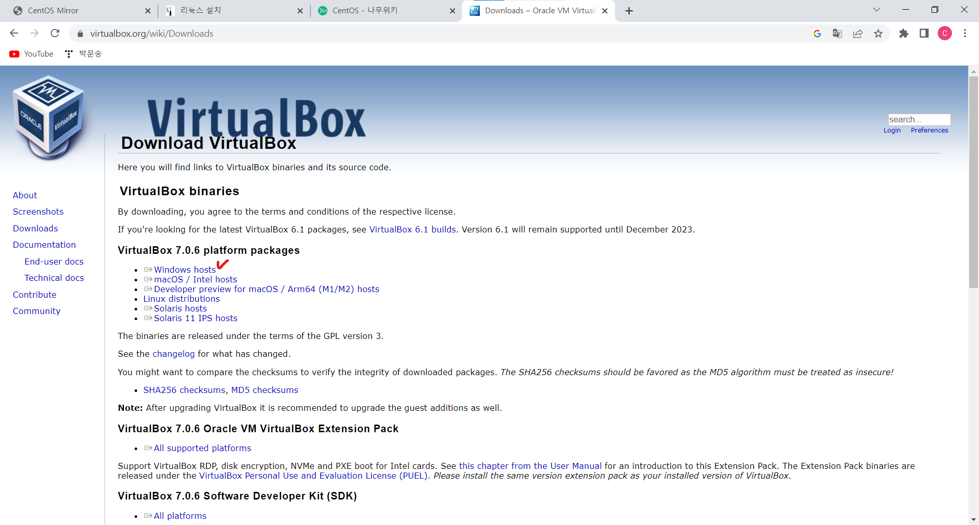 ㆍ ISO준비는 완료됐다. 다음으로 가상머신을 다운받는다. https://www.virtualbox.org/wiki/Downloads 해당 URL로 이동 후 아래 사진에 체크되어 있는 문구를 클릭하여 다운로드 받는다. OracleVM에도 여러 버전이 있으나 여기에선 7버전으로 진행한다.