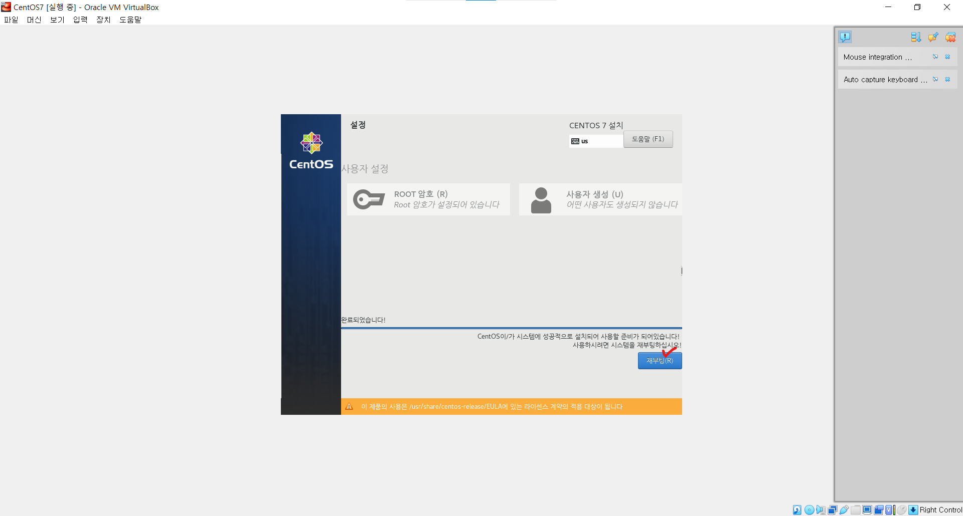 ㆍ 재부팅 완료 후 라이센스에 대한 약관 동의가 필요하다. 들어가서 약관 동의 후 완료를 한다.