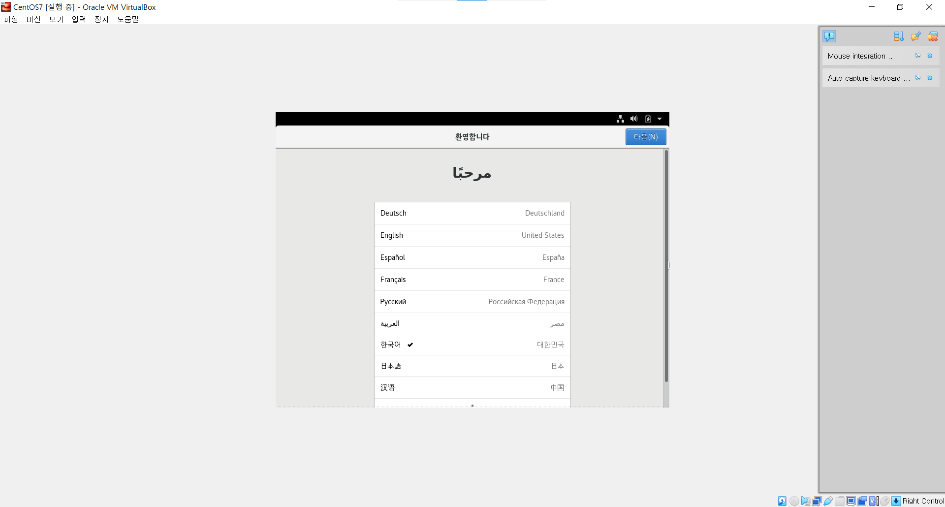 ㆍ OS가 실행되었다. 언어를 선택하라고 하는데 우리는 이전에 한국어를 선택해둔 히스토리가 있으므로 다음으로 넘어간다.