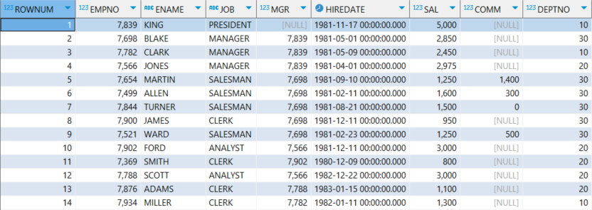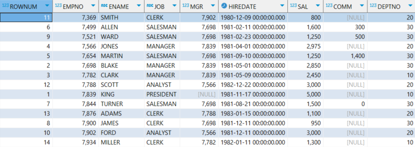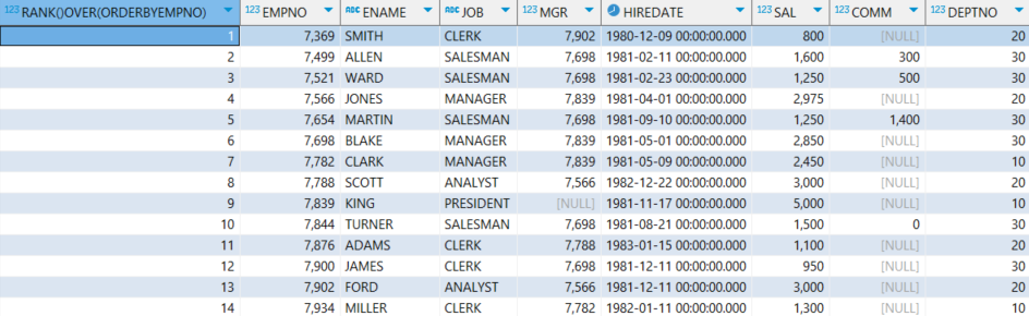 단, ORDER BY에 명시된 컬럼의 데이터가 중복 가능성이 있다면 해당 함수로는 ROWNUM을 대체 할 수 없다. (자세한 내용은 RANK(), DENSE RANK() 참조)