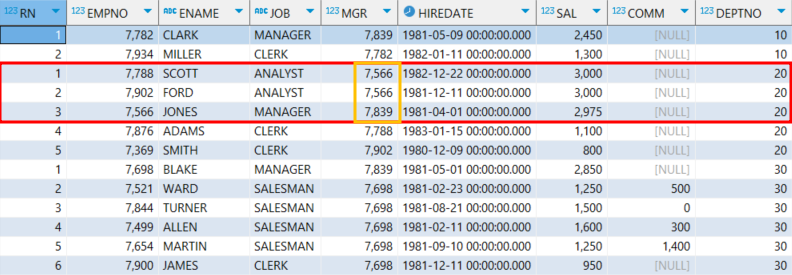 두 쿼리의 결과를 보면 EMPNO Column으로 정렬이 된 것은 동일하나 ROWNUM이 다르게 적용 된 모습을 볼 수 있다.